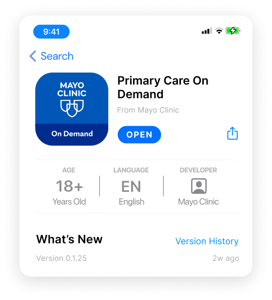 Our new mobile app connects you to Mayo Clinic providers 24/7. Download the app to receive the medical care you need on your schedule. Available in Wisconsin, Minnesota and Iowa.